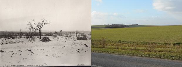 Les photos sélectionnés concernent quelques secteurs en Champagne. Ils sont l'oeuvre des troupes françaises, allemandes et américains combattants. À côté est placée une photographie prise un siècle plus tard au même endroit.