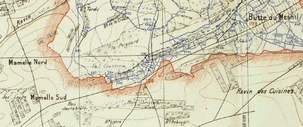 Sur ce plan de fin 1915, la ligne conquise par les troupes françaises en rouge, restera inchangé jusqu'en 1918.