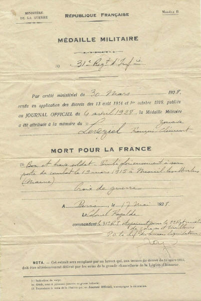 François Leveziel a reçu la Croix de Guerre pour sa bravoure sous le feu de l'ennemi et la Médaille Militaire