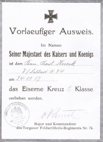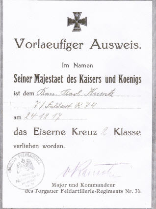 Karl reçoit le 24 décembre 1917 la Croix de Fer de 2e classe parce qu'il s'est distingué par sa bravoure sous le feu de l'ennemi. La Croix de Fer de 2e classe fut attribuée à environ 5 millions de combattants allemands.