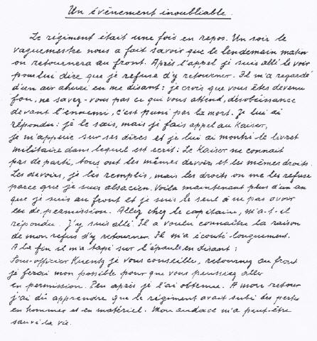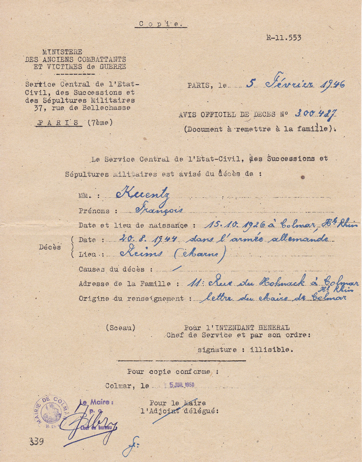 Son fils François, alors âgé de 17 ans, a été incorporé de force dans une formation SS en février 1944. Il portait donc l'uniforme allemand en Normandie, lors des combats contre les Américains. C'était un „ Malgré-nous „