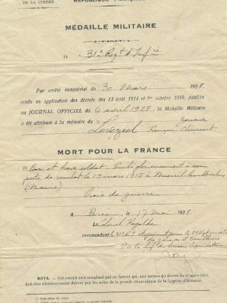 Son régiment prend part aux violents combats de mars 1915, à la côte 196 au Nord-Est de Mesnil-les-Hurlus en Champagne. Lieu où le 19 mars 1915, la mort l'attendait sur le champ de bataille.