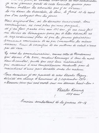 Am 18 Februar 2005 feierte Charles Kuentz seinen 108 Geburtstag mit seiner Tochter Marie-Thérèse und seinem Sohn Gérard bei sich zu Hause „ In Colmar hat noch niemand dieses Alter erreicht „ bestätigt Marie-Thérèse. Die Erinnerungsarbeit war die letzte Berufung der Familie Kuentz: als eine Person trugen diese drei friedliebenden Pensionnierten die Friedensflamme.