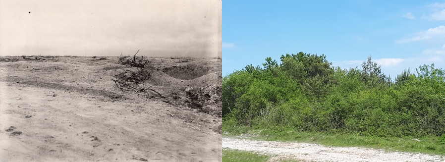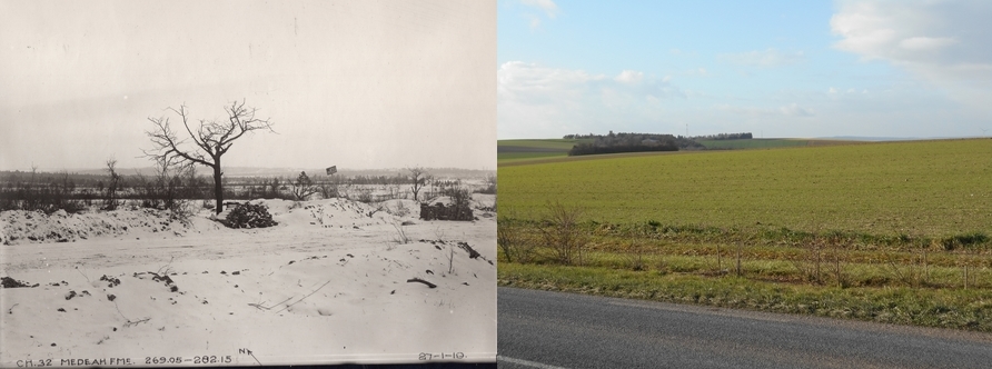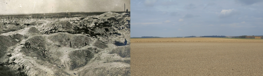 Les photos sélectionnés concernent quelques secteurs en Champagne. Ils sont l'oeuvre des troupes françaises, allemandes et américains combattants. À côté est placée une photographie prise un siècle plus tard au même endroit.
