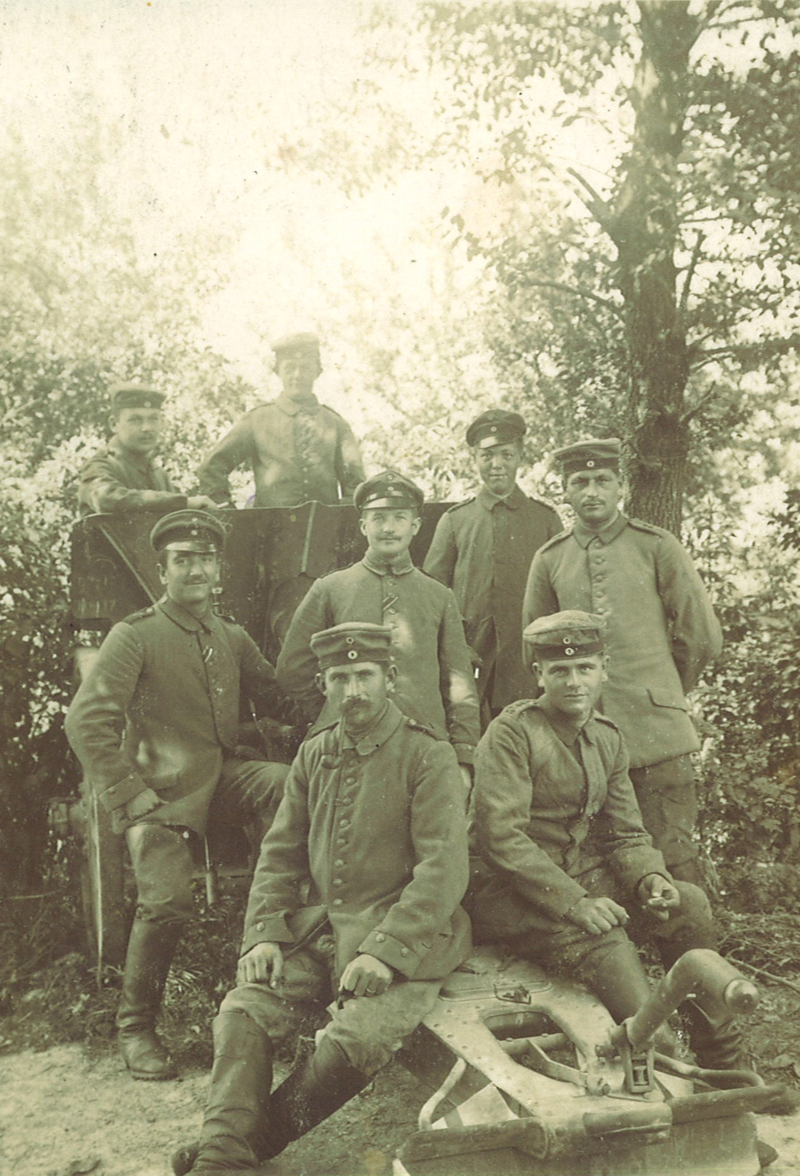 Karl Kuentz ( en haut à gauche ) avec le 74. Torgauer Feld-Artillerie-Regiment 1917 en Artois. L'équipe de pièce est composée: -du chef de pièce -du pointeur ( Karl ) -du chargeur -du tireur -des pourvoyeurs