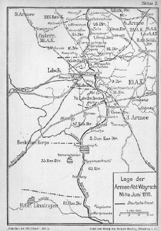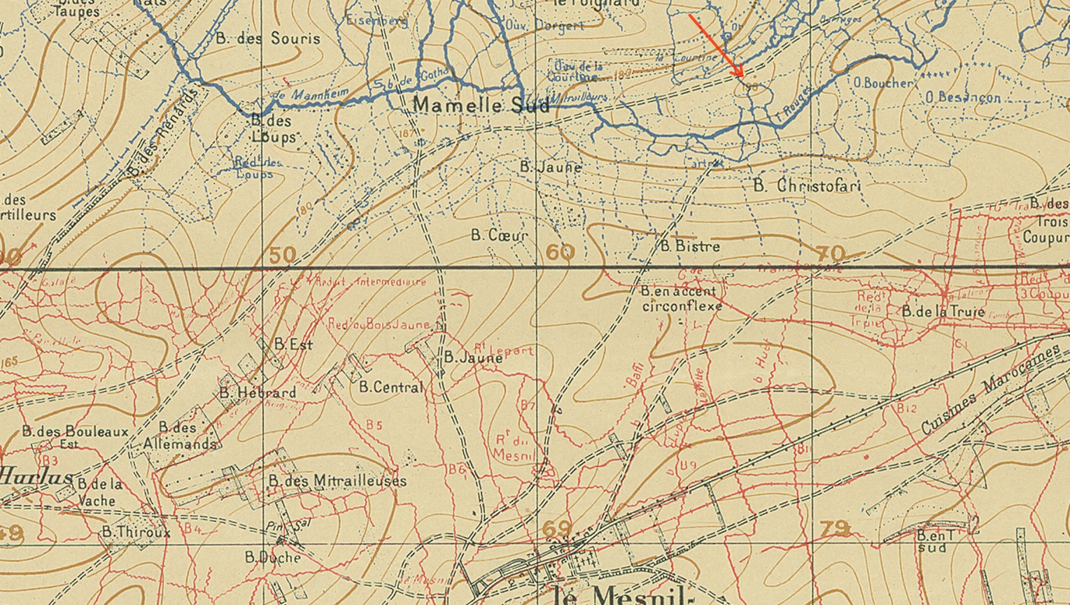 Die rote eroberte Linie von Ende 1915 durch die französischen Truppen auf diesem Plan blieb unverändert bis 1918.