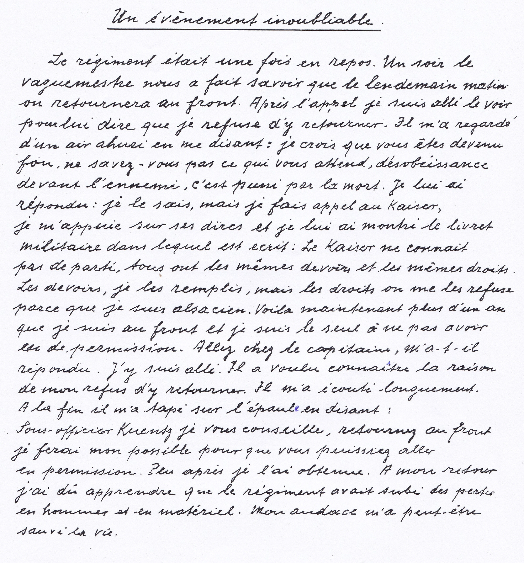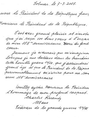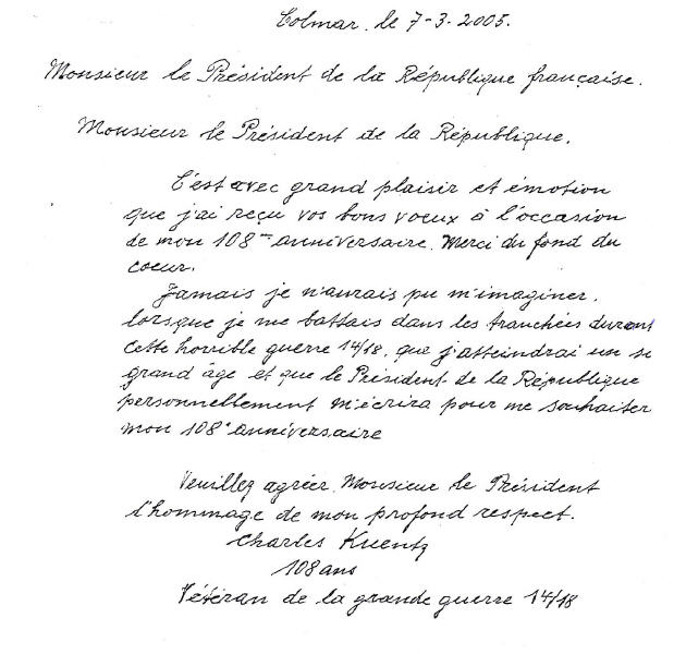 Am 18 Februar 2005 feierte Charles Kuentz seinen 108 Geburtstag mit seiner Tochter Marie-Thérèse und seinem Sohn Gérard bei sich zu Hause „ In Colmar hat noch niemand dieses Alter erreicht „ bestätigt Marie-Thérèse. Die Erinnerungsarbeit war die letzte Berufung der Familie Kuentz: als eine Person trugen diese drei friedliebenden Pensionnierten die Friedensflamme.