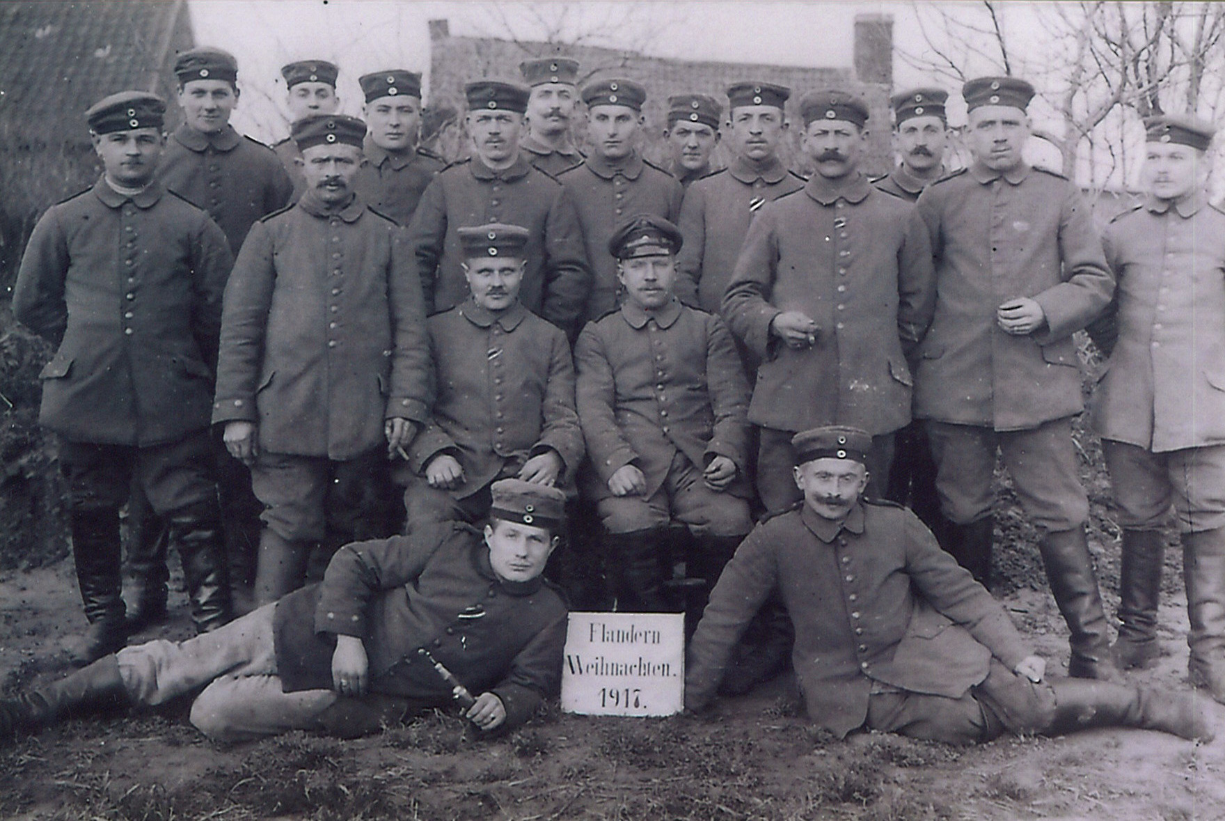 Karl Kuentz ( 1er à droite ) a passé Noel 1917 en Flandres. Les soldats faisaient des photographies quelques jours avant le 24 décembre afin de pouvoir les joindre à leurs voeux.