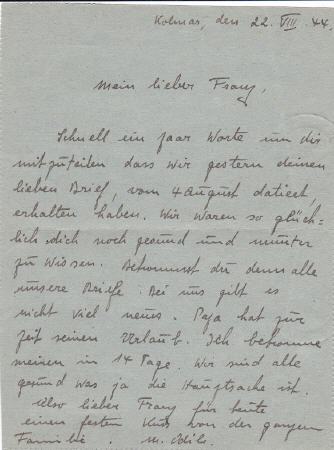 La dernière lettre que Marie-Odile a écrite à son frère est datée du 22 août 1944. Elle ne savait pas encore que François avait été tué le 20 août en Normandie. Der letzte Brief den Marie-Odile an ihren Bruder am 22 August 1944 schrieb. Sie wusste noch nicht daß François am 20 August gefallen war.