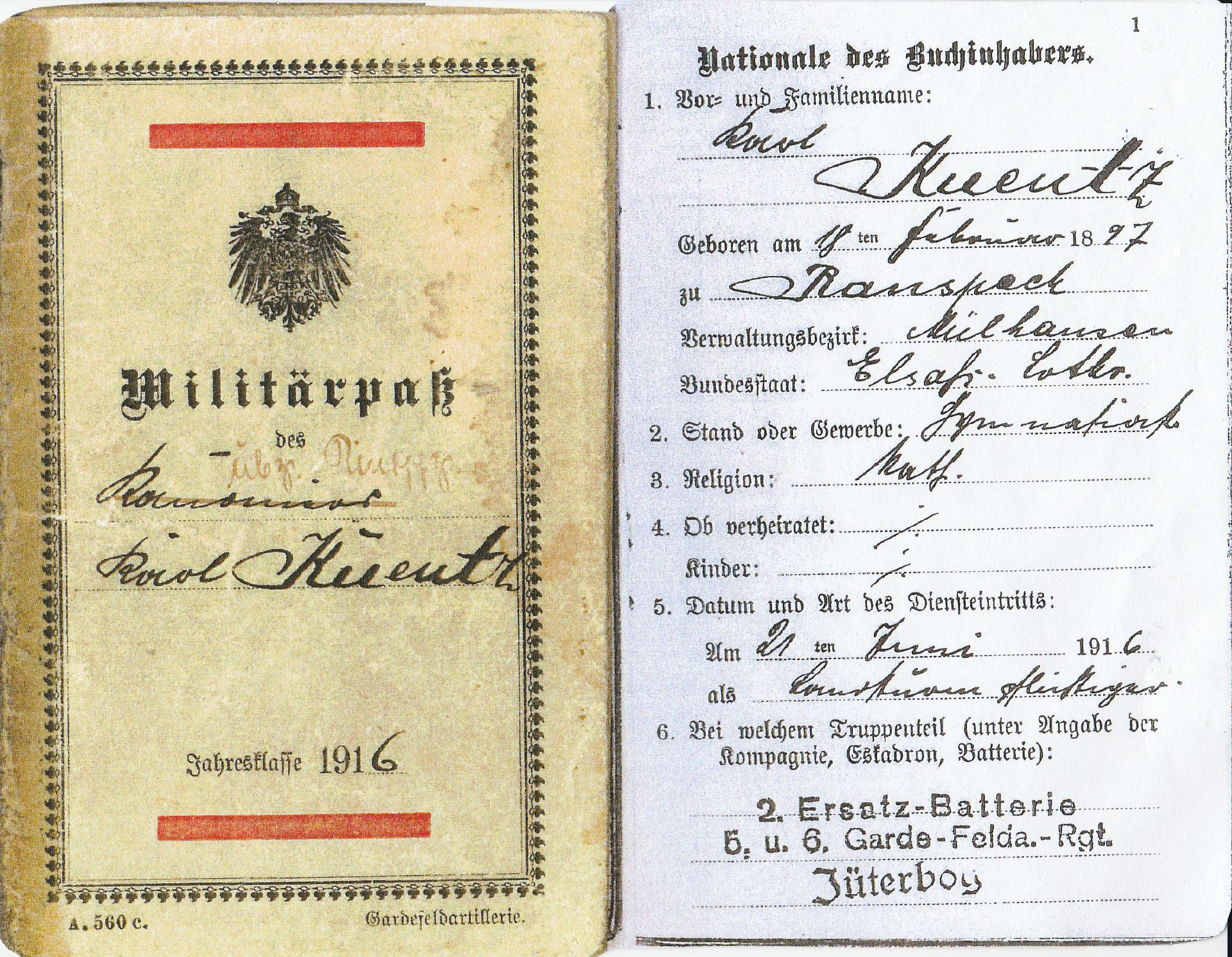 Karl ( Charles ) Kuentz wurde am 18 Februar 1897 in Ranspach am Oberrhein geboren, während einer Epoche wo Elsass-Lothringen seit 1871 dem deutschen Reich angehörte. Karl wechselte vier mal in seinem Leben die Nationalität.