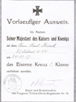 Karl reçoit le 24 décembre 1917 la Croix de Fer de 2e classe parce qu'il s'est distingué par sa bravoure sous le feu de l'ennemi. La Croix de Fer de 2e classe fut attribuée à environ 5 millions de combattants allemands.
