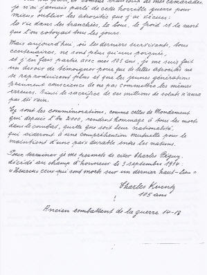 Am 11 November 2004 besuchten Kinder aus Colmar und Belfort Charles Kuentz bei sich zu Hause. Über 100 Jahre Altersunterschied zwischen Charles und seinen Gästen. Vom ersten Weltkrieg wußten die Kinder nicht viel bestätigte Charles Kuentz. Aus diesem Grund machte er sich zur Aufgabe den Kindern den Krieg zu erklären, denn sie sind die Generation der Zukunft.