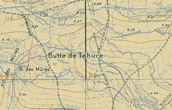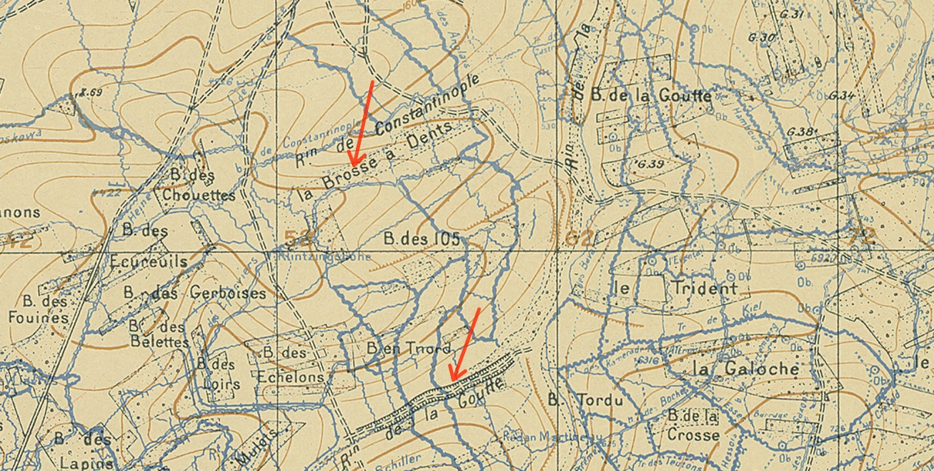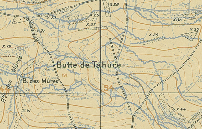 La côte 196 se trouvait entre le Bois jaune Brûlé (Granat Wäldchen) et le Bois Christofari (Traube)